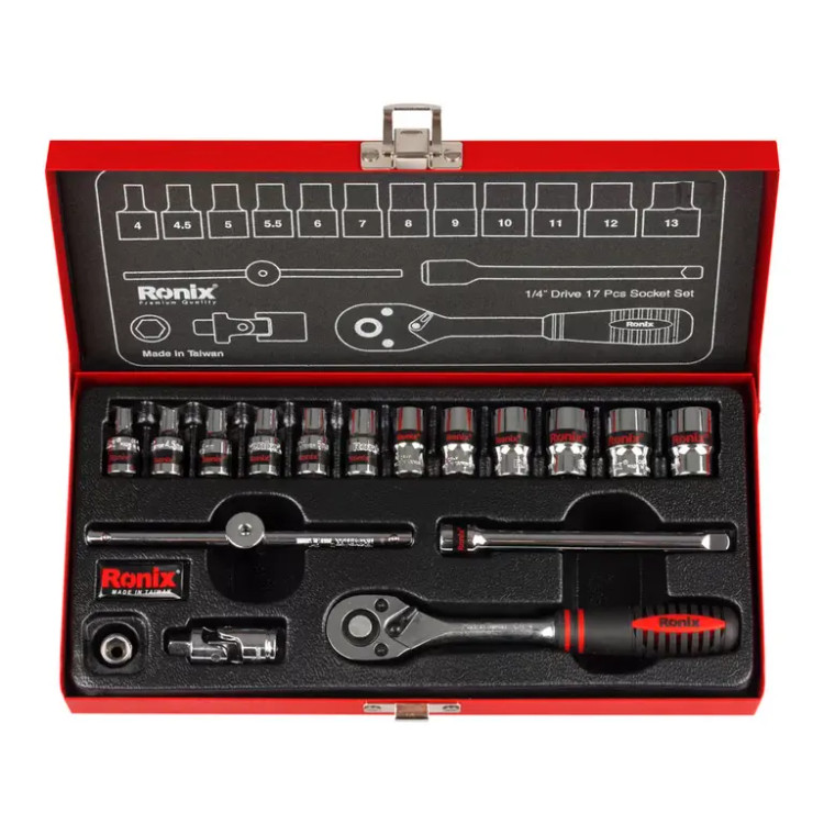 مجموعه بکس RH-2617 رونیکس متشکل از 17 قطعه متفاوت اعم از آچار، سری و دسته است که سایز درایو همگی آنها 1/4 اینچ است. قطعات این جعبه بکس عبارتند از: