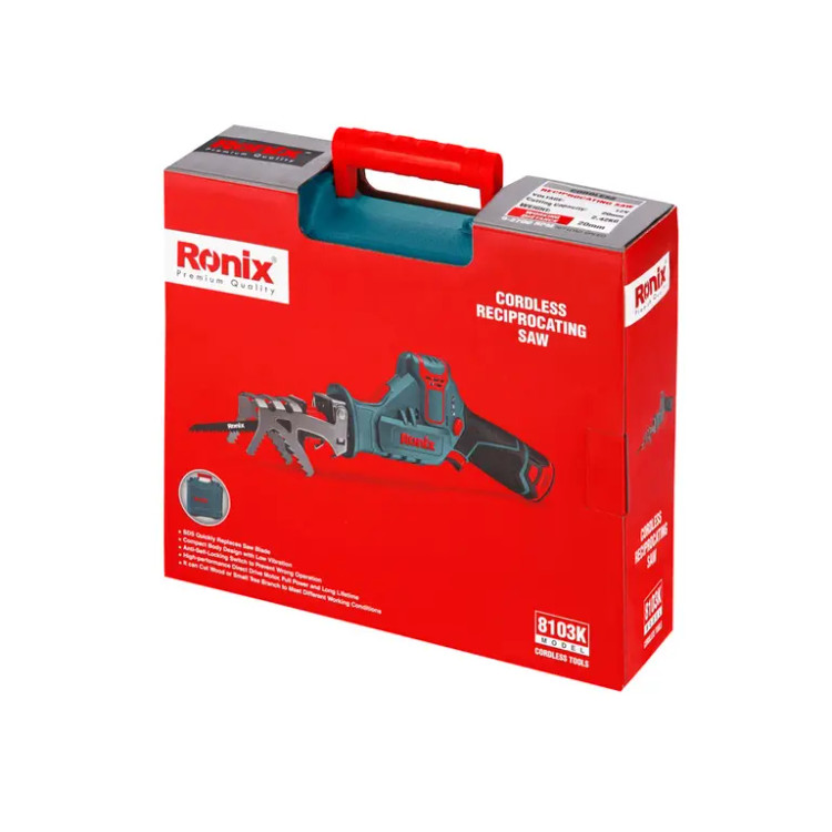 طراحی اره همهکاره یا افقیبر شارژی 8103K رونیکس و ساختار لولهایشکل آن، استفاده از این ابزار را در فضاهای با دسترسی محدود امکانپذیر میکند. این اره به یک موتور 12 ولت DC کوچک اما قدرتمند و با راندمان بالا تجهیز شده است. در این محصول شارژی، از باتری لیتیوم یون 12 ولت با ظرفیت 2 آمپرساعت به عنوان منبع تغذیه استفاده میشود. ابزارگیر این اره افقیبر، اتوماتیک بوده و تعویض سریع و آسان تیغه را برای کاربر امکانپذیر میکند. افزونبراین، در قسمت بالایی این ابزارگیر،میتوان پایهای را برای باغبانی و شاخهزنی نصب کرد.